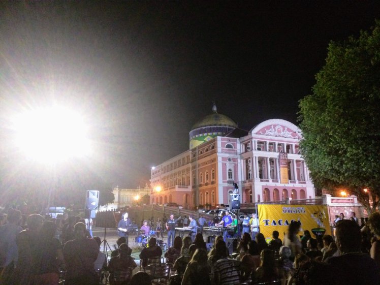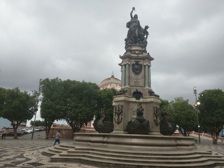 Two liquids of different densities don’t mix, like oil and water. But when two slightly different variants of the same liquid touch each other, you would expect them to blend together and produce a new homogeneous liquid. Right? Not in the Amazon! El Río Negro meets the Amazon River near Manaus, Brazil, they share a 40 km (~25 miles) “border” without mixing. You can see and feel the difference. El Río Negro is darker, has high acidity (4.6 pH), warmer (26°C, 78°F) and slower. The Amazon River, or Rio Solimões as it’s known in that area, has low acidity (6.8 pH), cooler at 23°C/73°F and runs faster. Because of its speed (7 km/hr, 4.35mph), it washes off the clay shores which gives the water its light brown color. The high acidity and relative shallowness of El Río Negro (16 meters/52 ft max depth) make it home to only 300 types of fish as opposed to 2000 varieties in the Amazon (60 meters/197 feet max depth). The best part is that mosquitoes cannot breed in El Río Negro! It contains 60% minerals, including iron and uranium and 40% organic matter. The Amazon River is a gold mine, literally and figuratively. The region is very rich in resources: oil, minerals, gold, wood, rare flora and fauna, raw materials..etc, and is being exploited to the detriment of the environment, the wild life and the indigenous peoples. The government is giving incentives for companies to invest in the region by charging no taxes. So you come to the Amazon, only to find manufacturing plants for cars, digital devices, oil companies and other “modern” sores. Now Manaus, the capital of Amazonia state, is a busy polluted, grid locked metropolitan city with traffic jams, high rises and high blood pressure. Can’t blame them for “paving paradise to put up a parking lot”*. They want “progress” too and they have the resources to get it. The only silver lining is that arts flourish; free music and dance shows daily in the Opera House in addition to live music in the square, complete with drinking, smoking and trash everywhere.