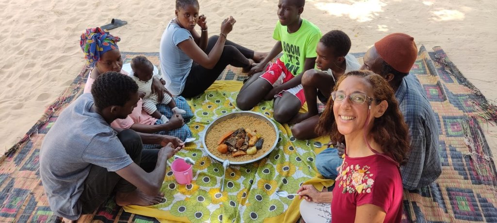 We’re sitting in a circle on a straw mat on the ground. A piece of fabric is spread in the middle. A big round covered tray is brought from the kitchen and placed in the center of the fabric. The cover is lifted revealing a pile of vegetables and fish (or chicken) on top of spiced rice. Everyone digs in and eats from the area closest to them. Some scoop up the food with spoons, others with their hands. Every now and then, someone distributes pieces of veggies and meat to other corners so people don’t have to reach too far.