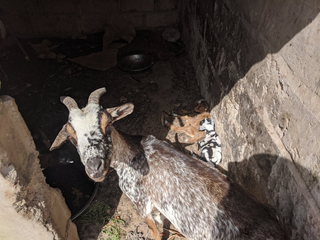 Whatever is left goes to the animals; fish bones to cats, rice and veggies to goats, crumbs on the ground get devoured by chicken, pigeons and birds. Nothing goes to waste. Not many dirty dishes to wash either. Just the main dish and the spoons that were used. 2 or 3 medium sized fish (or half a chicken) can easily feed 10-15 people.